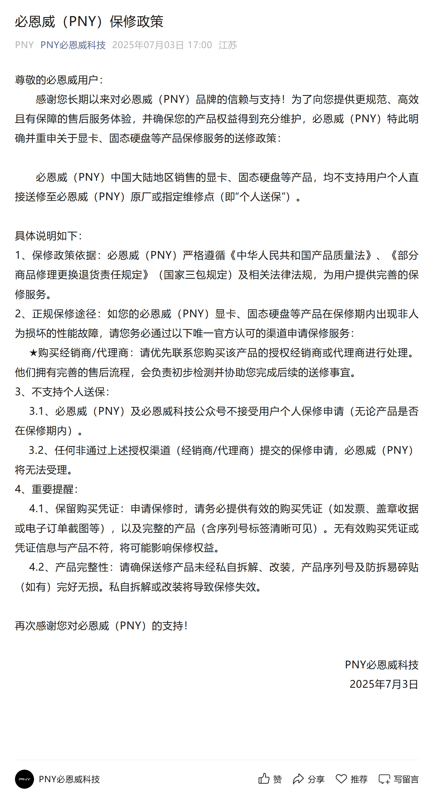 必恩威(PNY)重申保修政策